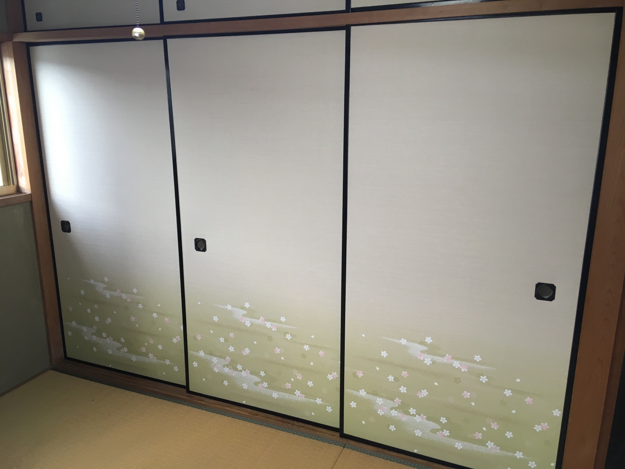 淡いグリーンの背景に可愛い桜模様の襖にご変更されました。すごく優しい雰囲気で心がなごみますね。いい香りがしてきそうです。
